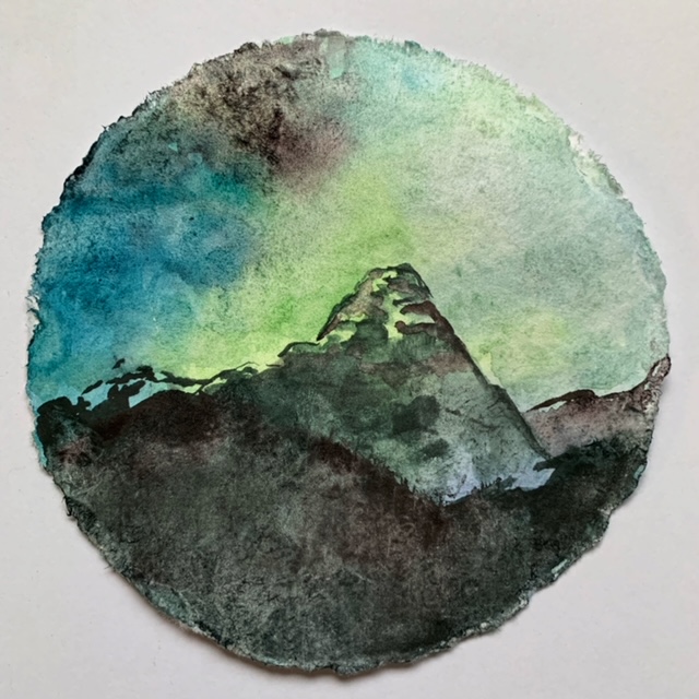 Circular 6″ sumi ink & watercolor painting on thick, handmade, recycled paper. Framed in an 8×8 black wood frame (w/ window matting w/ black background & a custom cut circular white foreground, so you can see the edges). Titled, signed & dated on matting. Please contact me through the Info page w/ any questions.